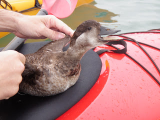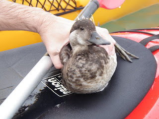 Cuando llegamos a ellos, salieron volando, pero nos llamo la atención que volaban en circulo alrededor de nosotros sin querer abandonar la zona....pensamos que habia un buen banco de peces bajo los kayaks, pero lo que ocurria es que habian dejado a esta hembra, probablemente enferma (fijaos que la cola la tiene desplumada) que no podia ni decir CUAK, como ronca o asfixiada. La pobre se acomodó en cubierta y cuando la soltamos intentaba volver a subir a la comodidad de la Sedna: