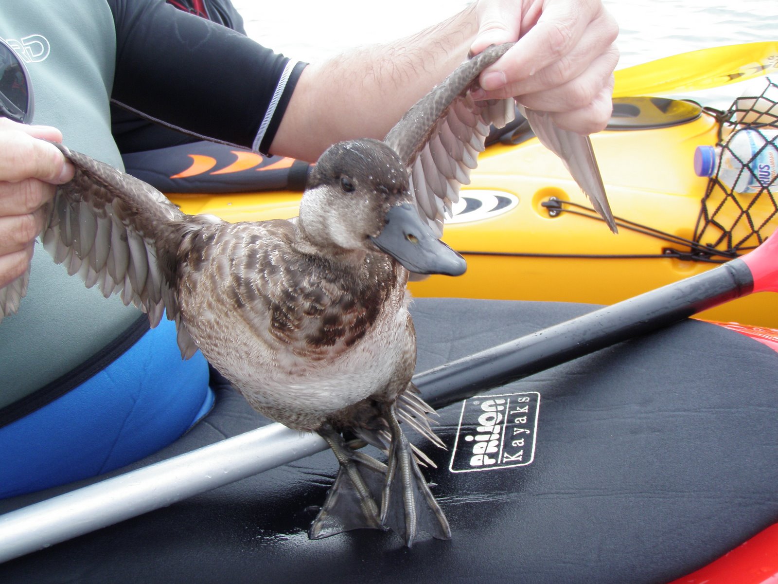 Cuando llegamos a ellos, salieron volando, pero nos llamo la atención que volaban en circulo alrededor de nosotros sin querer abandonar la zona....pensamos que habia un buen banco de peces bajo los kayaks, pero lo que ocurria es que habian dejado a esta hembra, probablemente enferma (fijaos que la cola la tiene desplumada) que no podia ni decir CUAK, como ronca o asfixiada. La pobre se acomodó en cubierta y cuando la soltamos intentaba volver a subir a la comodidad de la Sedna: